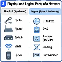 All of these parts work together to make a network function. Cables or wireless signals carry the data; NICs connect devices; switches and routers move the data, IP addresses identify devices, and DNS helps users locate resources easily. Together, these components form the foundation of every network, from a small home setup to the global internet.