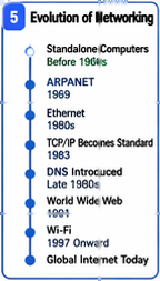 All of these developments worked together to change networking from a few small, separate experiments into the strong and dependable system used in modern ICT today. Packet switching, TCP/IP, Ethernet, DNS, the Web, and wireless LAN each added an important part to the network. This progress did not happen in one simple step. Instead, each new technology was built on the standards created before it. Because these standards allowed different systems to work together, networks were able to grow from just four connected computers to billions of connected devices around the world.