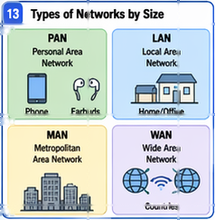 Before looking at the parts of a network, it is helpful to understand the main types of networks based on size. A local area network (LAN) connects devices in a small area, such as a home, office, or school campus. A metropolitan area network (MAN) covers a larger area, such as a city or a large campus. A wide area network (WAN) connects places that are far apart, such as offices in different cities or countries. The internet is the best-known example of a WAN or a collection of WANs.