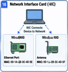 Every device needs a network interface card (NIC) to connect to a network. A NIC may provide a wired port, such as an Ethernet port, or a wireless connection through an antenna. Each NIC has a MAC address, which is a unique hardware address used to identify the device on the local network. MAC addresses are used only inside the local network and cannot be used across the internet like IP addresses.
