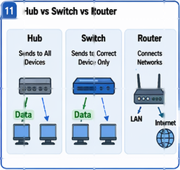 Some devices help control how data moves through a network. Early networks used hubs, which sent incoming data to every connected device. This caused extra traffic and reduced performance. Later, switches became more common. A switch sends data only to the correct device, which makes the network faster and more efficient. Routers connect different networks together and send data to the correct destination based on IP addresses. Wireless access points allow wireless devices to connect to a wired network through Wi-Fi.