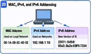 Devices are identified in two main ways. At the local network level, they use MAC addresses. At the wider network level, they use IP addresses. IPv4 uses 32-bit addresses and was the original main internet addressing system. As the internet grew, IPv4 addresses began to run out. To deal with this issue, methods such as CIDR and NAT were introduced. Later, IPv6 was developed. IPv6 uses 128-bit addresses, which provide a much larger number of unique addresses for modern and future networks.