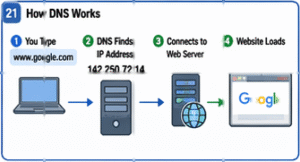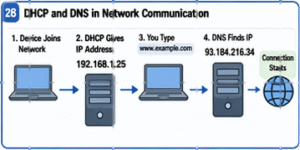 People do not usually type IP addresses because they are difficult to remember. Instead, we use easy names like google.com or youtube.com. A system called DNS (Domain Name System) changes these names into IP addresses so computers can find the correct destination. Another system called DHCP automatically gives devices the network settings they need, such as an IP address, when they join a network.