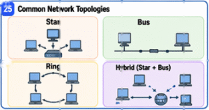 The most common types of network topology are star, bus, and ring. In a star topology, all devices connect to one central device, such as a switch or access point. This is the most common setup in modern networks because it is easier to manage and repair. If one connection fails, it usually affects only one device, not the whole network. In a bus topology, all devices share one main cable. In a ring topology, each device is connected to the next one in a circle.
