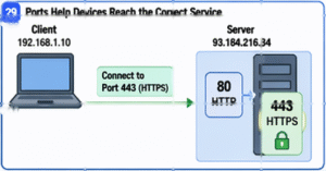 Networks also need a way to tell different services apart. This is done by using port numbers. For example, websites usually use port 80 for HTTP and port 443 for HTTPS. This means that for communication to work properly, a device needs more than just a connection. It also needs the correct IP address, the correct protocol, and the correct port number so the data can reach the right service.
