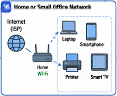 A small home or office computer network offers the clearest introductory example. A wireless internet router or gateway connects the site to an internet service provider. End devices such as laptops, phones, smart TVs, and printers join through Ethernet or Wi-Fi. Some devices consume content from remote servers, while others share local services such as printing or storage. Logically, this single environment already combines addressing, switching, wireless access, name resolution, service access, and routing to outside networks.